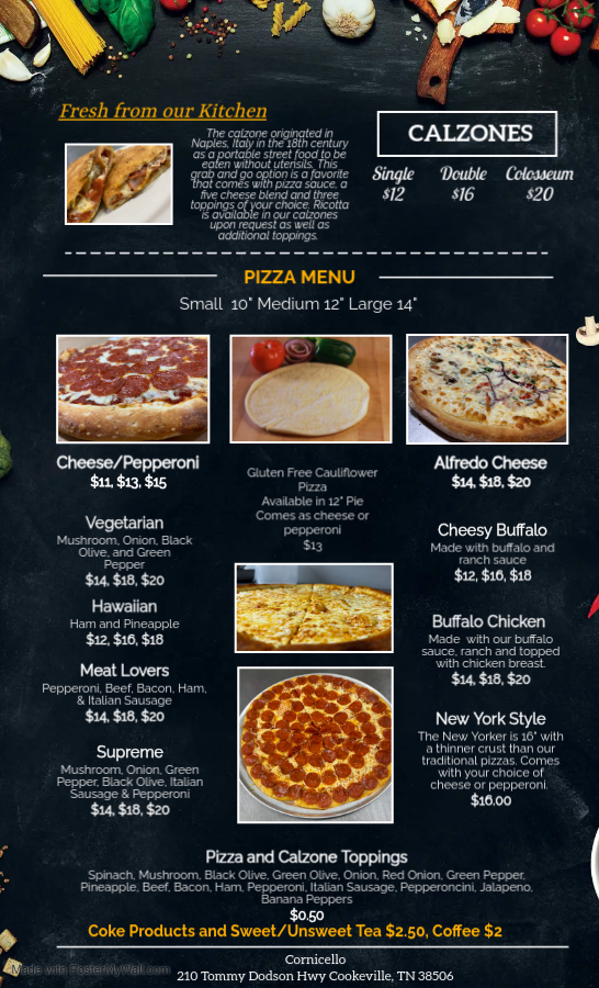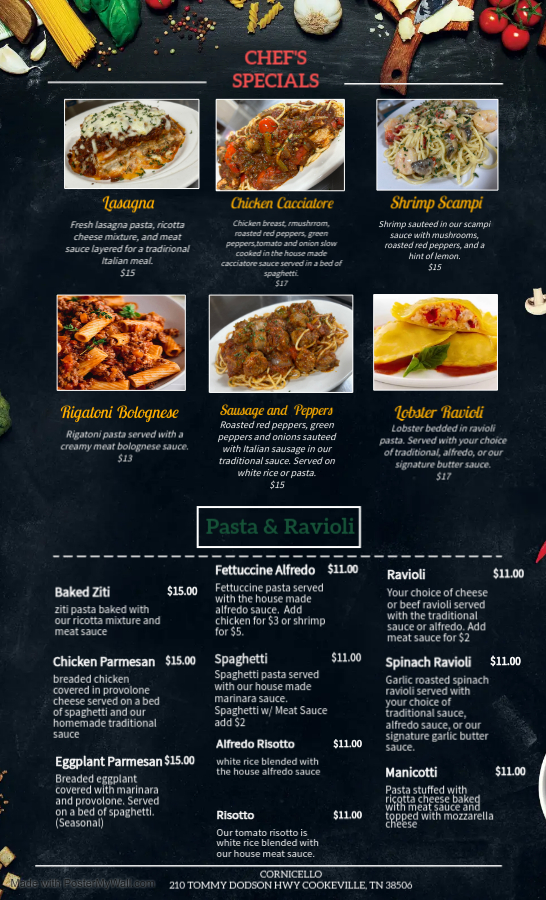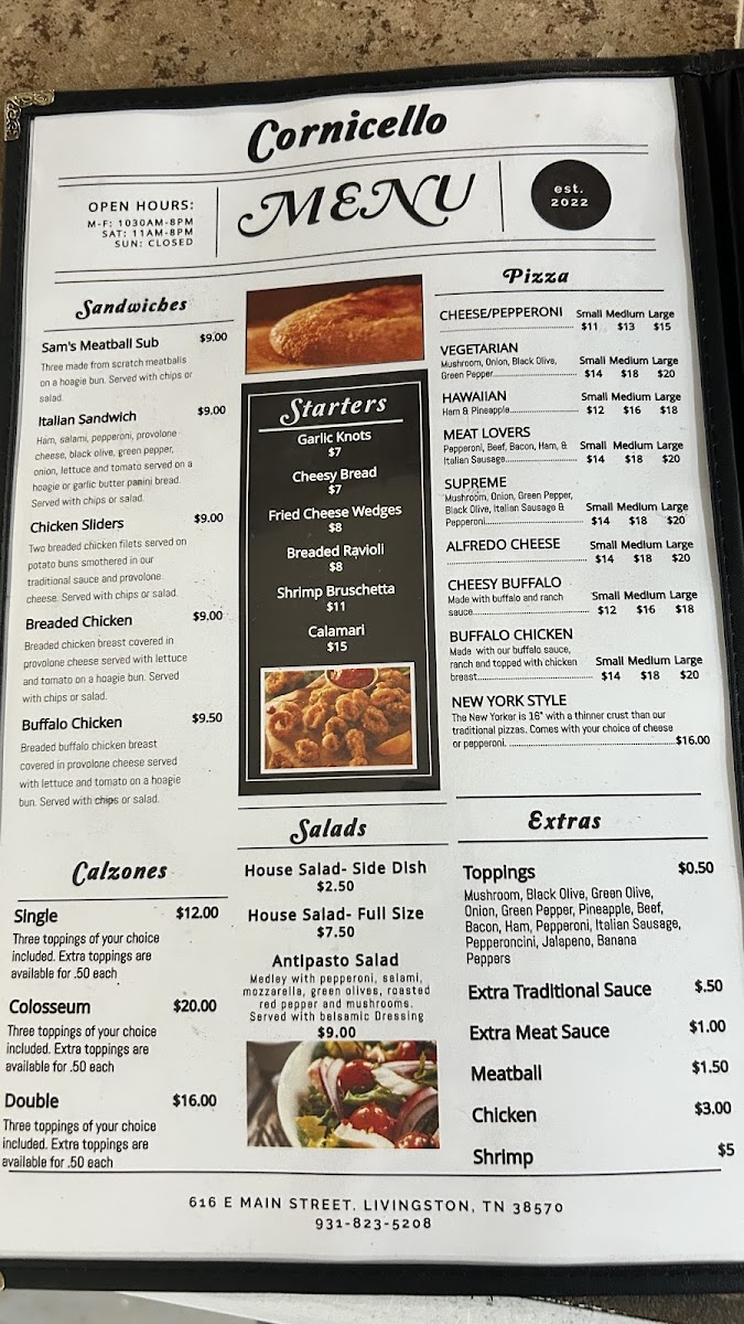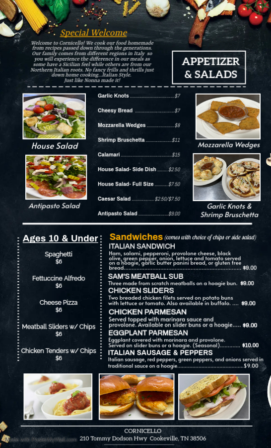 Welcome to Cornicello, a charming Italian restaurant nestled in Cookeville, TN. With a commitment to quality and a welcoming atmosphere, Cornicello stands out for its delicious menu featuring freshly prepared dishes. Customers rave about the pasta, particularly the spaghetti and meatballs, and the lasagna, hailed as “superb.” Each dish is made to order, ensuring that every bite is bursting with flavor.